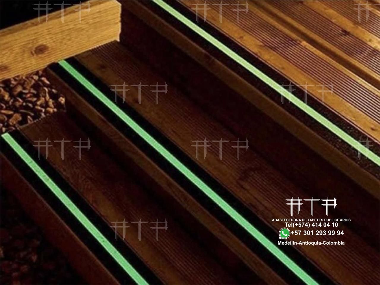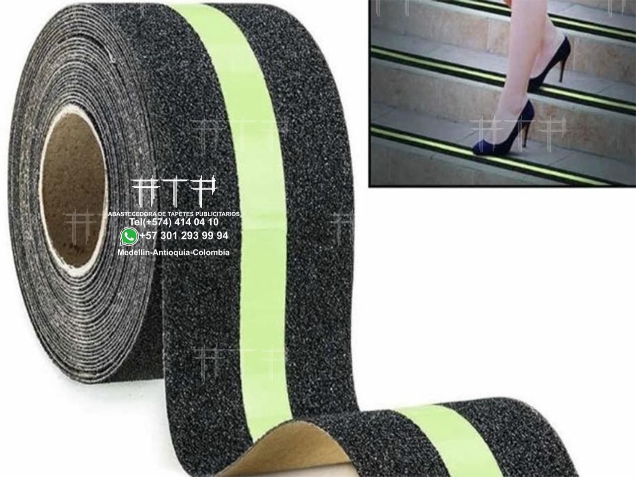 Cinta antideslizantes fluoresente adhesiva con superficie abrasiva en carburo de silicio, para evitar resbalar en zonas como escaleras y rampas, para exterior e interior